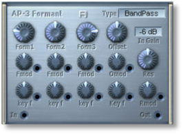 "a vowel filter with an X-Y vector control that allows smooth cross-fading between 4 vowel types at once. Each vowel is assignable to any of 11 types (IY, IH, EH, AE, AA, AO, OH, OO, UY, AH, AX). The filter is built from a special array of All-Pass filters yields 3 multi-mode filters which can be switched between High-Pass, Band-Pass, Low-Pass, All-Pass and Band-Reject via the text fader (which switches all 3 to the same type). This filter is great for making vocal effects on any sound source you wish." (Flexor Manual)
