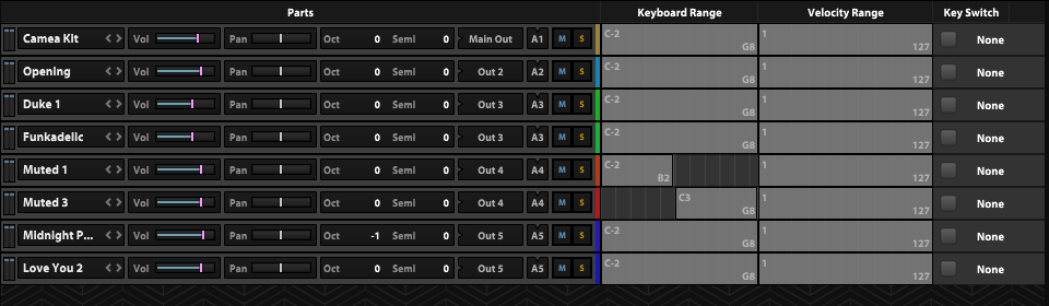 In Performance view you can eye and edit all the basic Part settings which you can also see in Main view / left sidebar / Part. Unique in Performance view is the possibility to define a Key Switch note number to turn a Part on and off. There is no way to drag and drop Parts from the File Browser, but you can exchange existing parts by double-clicking, which opens a browser, or by right-clicking a Part and chose one of the given options: