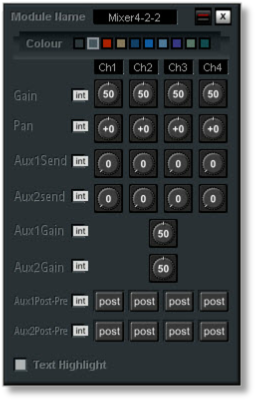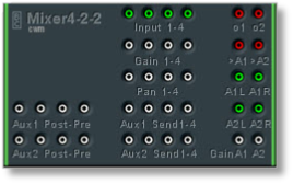 gain, pan, auxSend1, auxSend2, auxGain1, auxGain2, aux1pre-post switch, aux2pre-post switch.