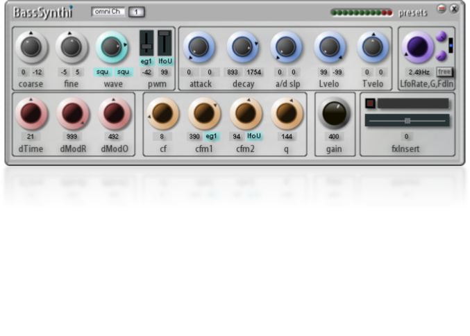 features: 2 multiOscs, 2 AD envelopes, tri lfo, 24dBLp filter, fx insert.