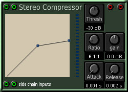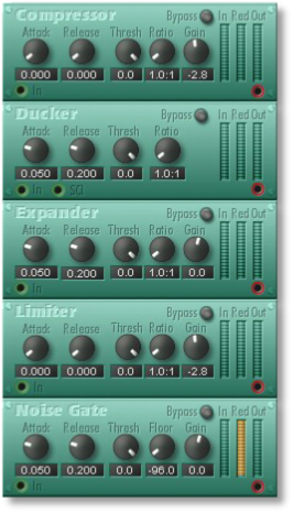 a special-purpose compressor. The level of the SideChain (SCI) signal remains constant, while the signal fed into the module (In) is attenuated according to level variations of the sideChain signal. (Ratio: 1:1=no effect, inf:1=max effect.) dspLoad 3.50/6.60/3.50
