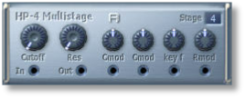 This is a four-pole (24db) high-pass filter with a unique feature: it enables free routing from any stage (1 to 4) within the internal filter structure, to be sent to the final audio output of the filter. The resonance has a unique sound character, as it is always fed-back from the fourth filter stage, no matter which stage is selected to be heard. This filter’s harmonic character is more complex than standard High-Pass filters, making it ideal for interesting pad and lead sounds. (Flexor Manual)