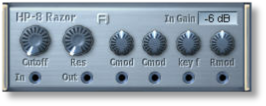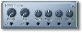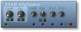 This is a four-pole (24db) high-pass filter. Its sharp yet silky character is ideal for creating classic leads, pads and riffs. Its modulation inputs are optimized to receive audio-rate modulation sources (like oscillators) to create amazing filter modulation effects. (Flexor Manual)