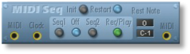 seq for up to two sequences, each with up to 32 steps. Record a new seq: hit Rec/Play, select Seq1 or Seq2 and play notes. Add steps to the selected seq: first select Seq1 or Seq2, then hit Rec/Play and play notes. Rest Note: specifies a NoteNr to insert rests into the seq. Transposed octave setting (C1=>C0)! Easy transposition (in Play mode) by incoming midi notes